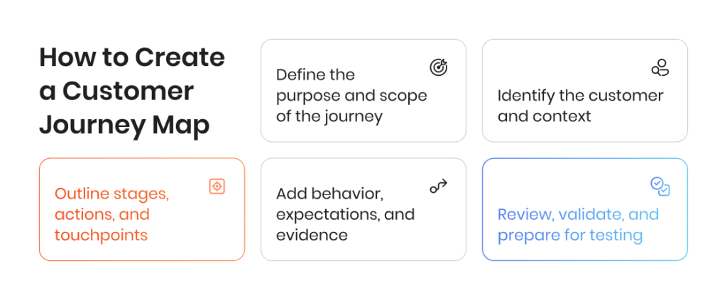 Start by clarifying why you want to create a customer journey map and what part of the journey you want to study. Some teams focus on onboarding or conversion, while others look at retention, support, or renewal. Defining scope early prevents the map from becoming too abstract or disconnected from testing needs.