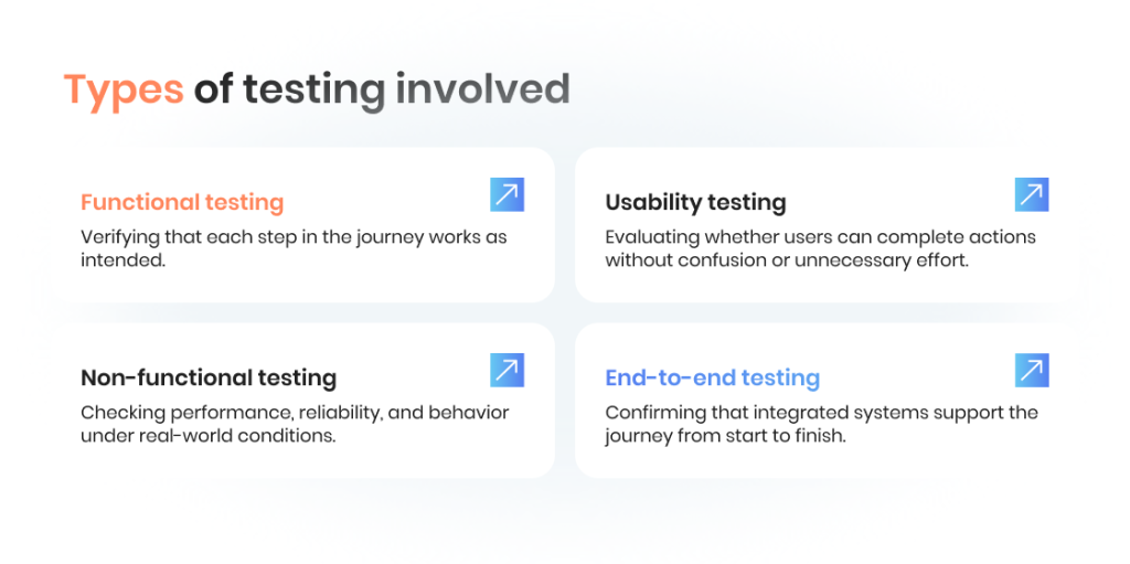 At this stage, testing teams often combine multiple testing methods within a single scenario, such as functional checks, usability testing, and non-functional testing, to reflect real conditions across the journey.