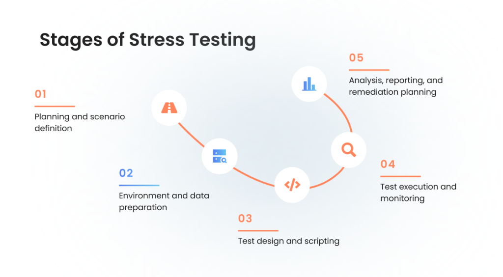 A well-executed stress test follows a structured testing process designed to reveal system limits, expose resilience gaps, and identify the conditions under which the application fails or recovers. While engineering teams handle the technical execution, product owners and CTOs can benefit from understanding how each stage contributes to overall system stability and operational readiness.
